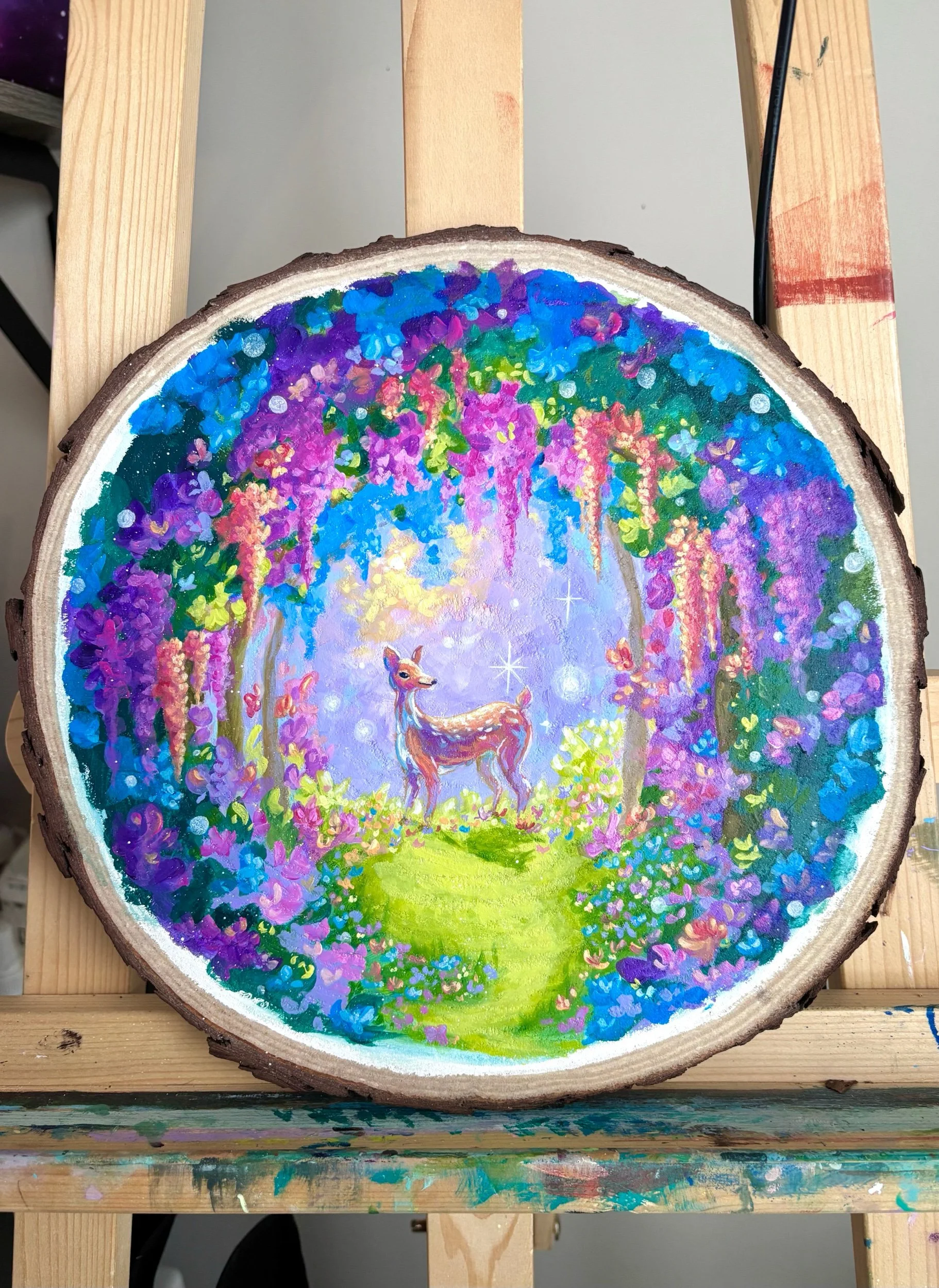 This whimsical wood slice painting was created in January of 2026 using acrylic paint on a 10 inch pine wood slice.