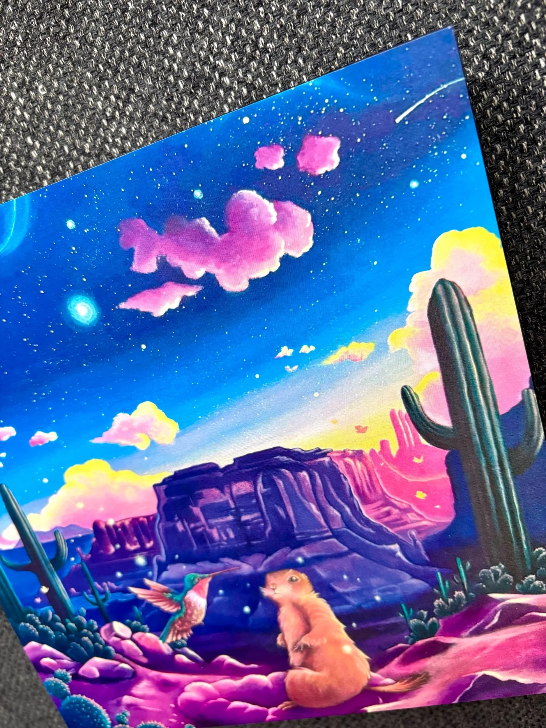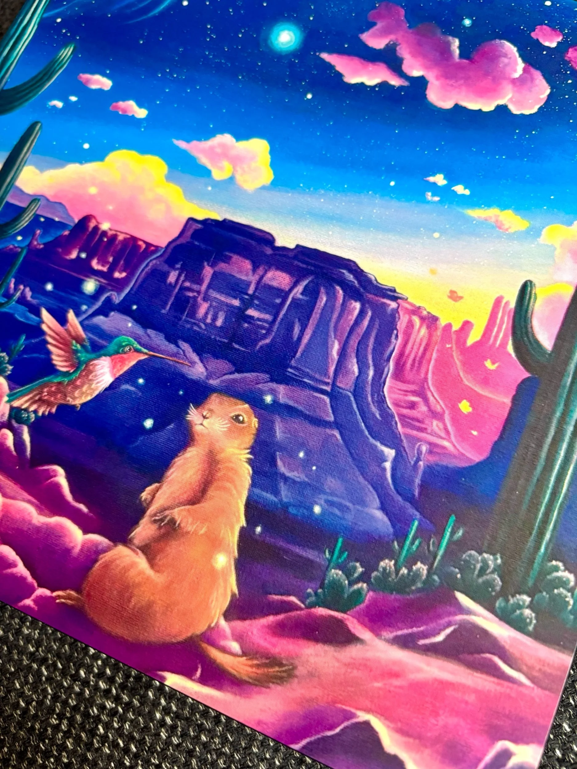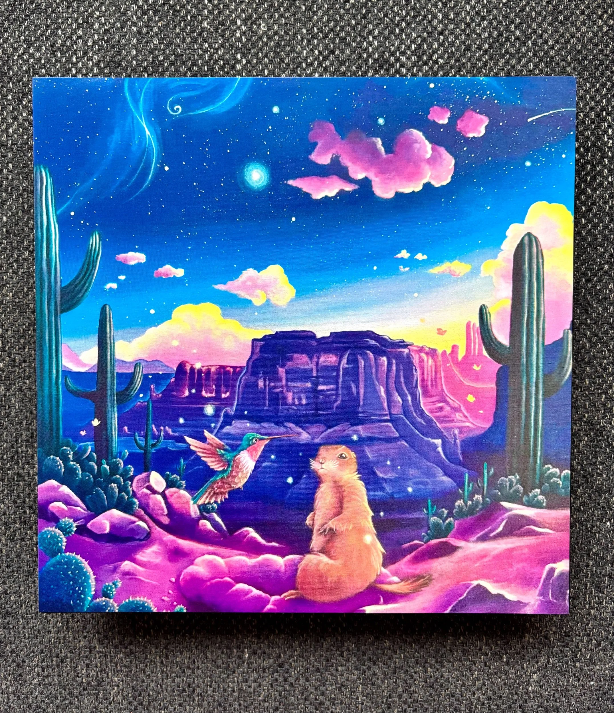 Originally painted after a 2024 roadtrip out west, my favorite time of day was “prairie dog o’clock” which was dawn and dusk. The prairie dogs would perk up from their holes and watch the sun get low, so many of them, sometimes thousands! The hummingbird signifies our beloved grandmother who passed away in 2023 showing up throughout our roadtrip, at every campsite in the form of many Hummingbirds. We got to watch their mating dances, some even flew inches from our faces and hovered staring us in the face.