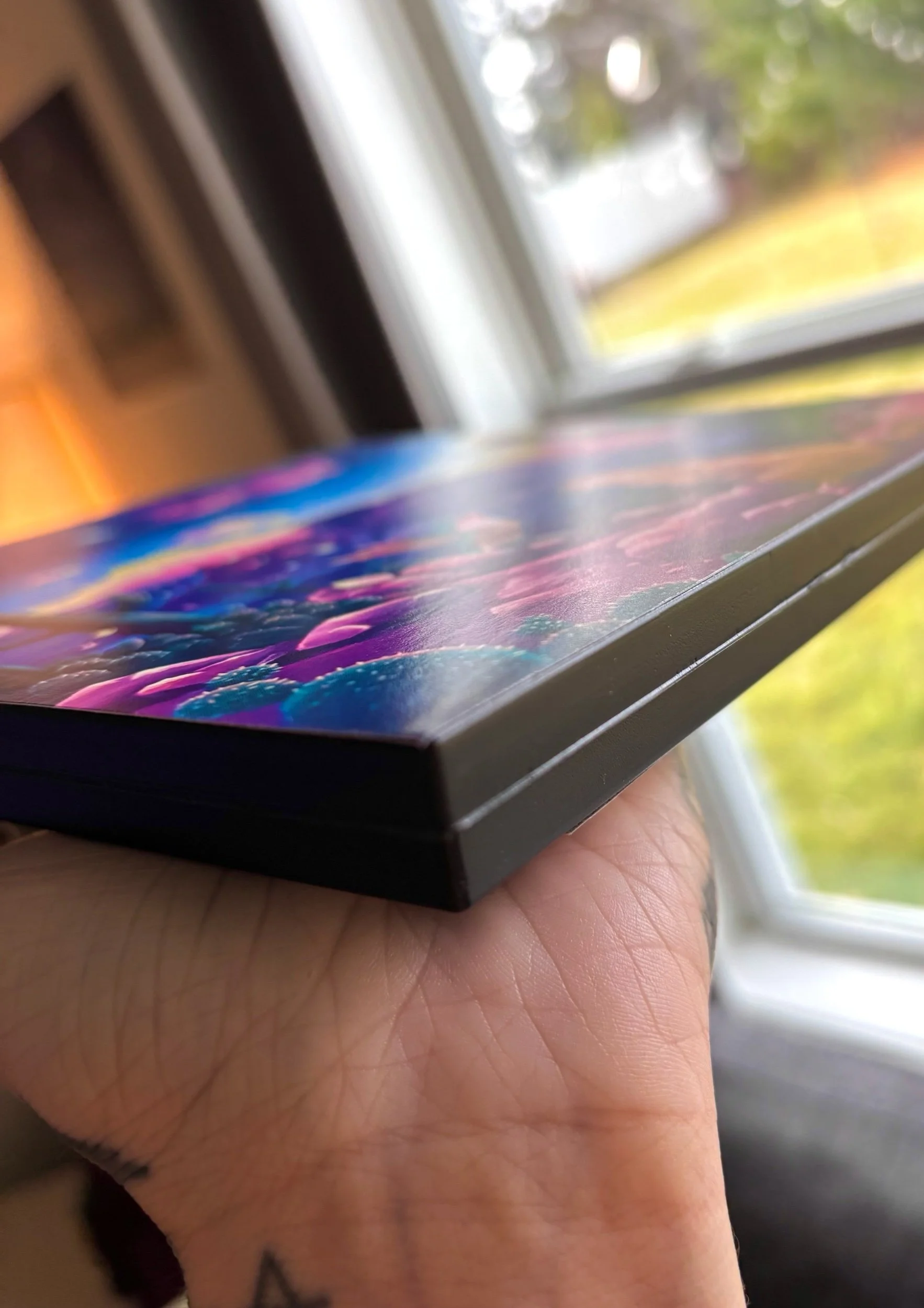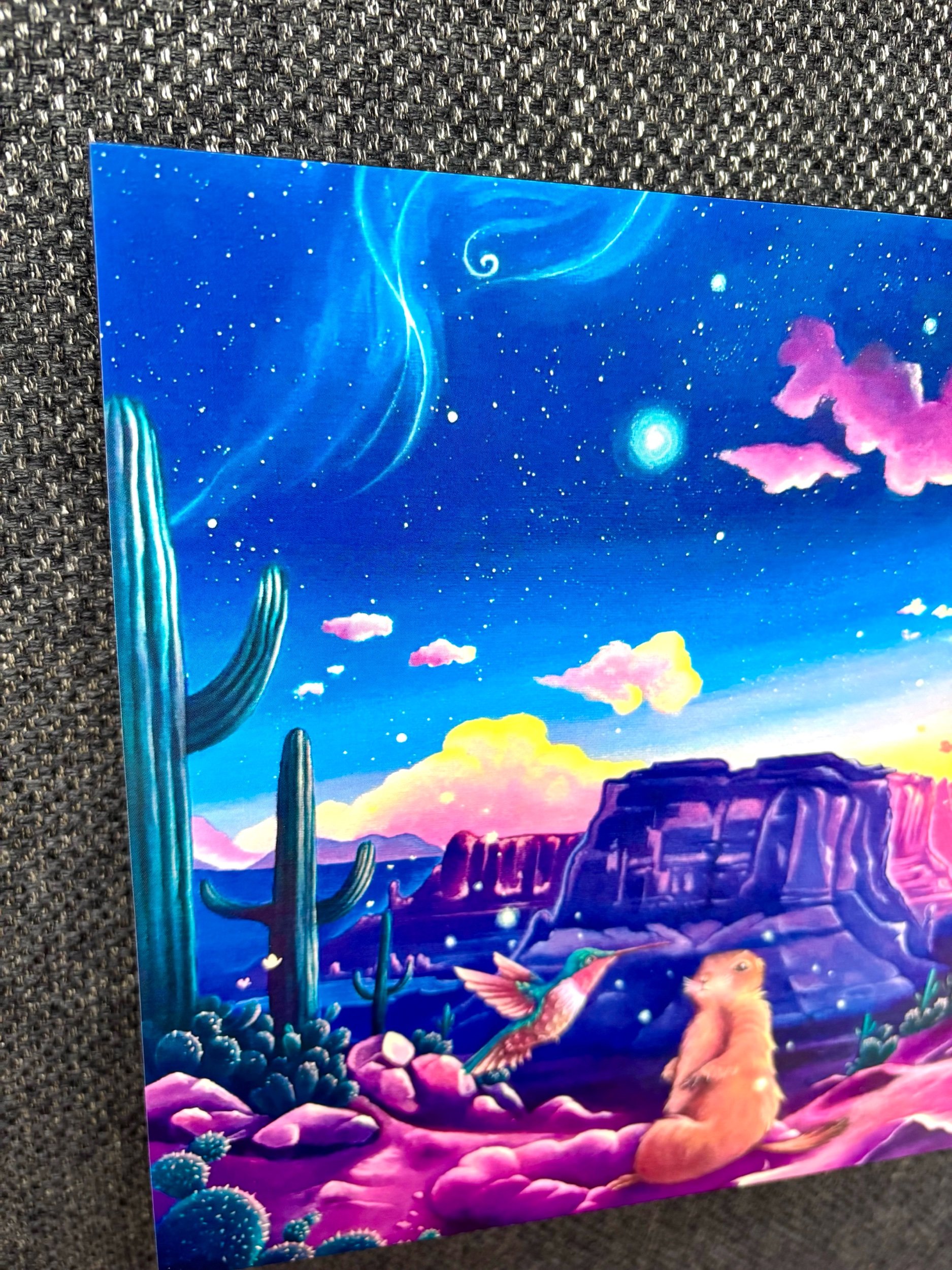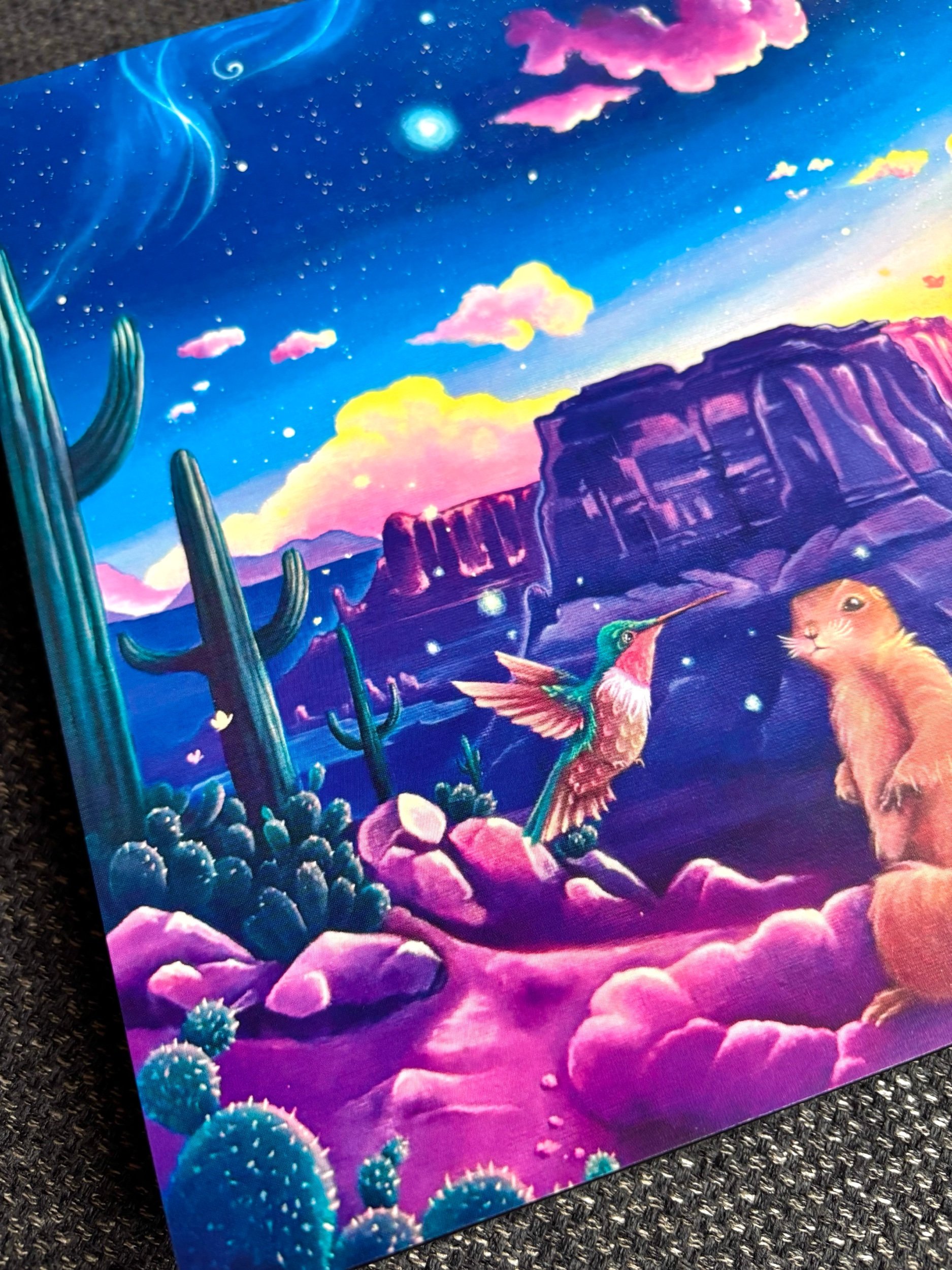 Originally painted after a 2024 roadtrip out west, my favorite time of day was “prairie dog o’clock” which was dawn and dusk. The prairie dogs would perk up from their holes and watch the sun get low, so many of them, sometimes thousands! The hummingbird signifies our beloved grandmother who passed away in 2023 showing up throughout our roadtrip, at every campsite in the form of many Hummingbirds. We got to watch their mating dances, some even flew inches from our faces and hovered staring us in the face.